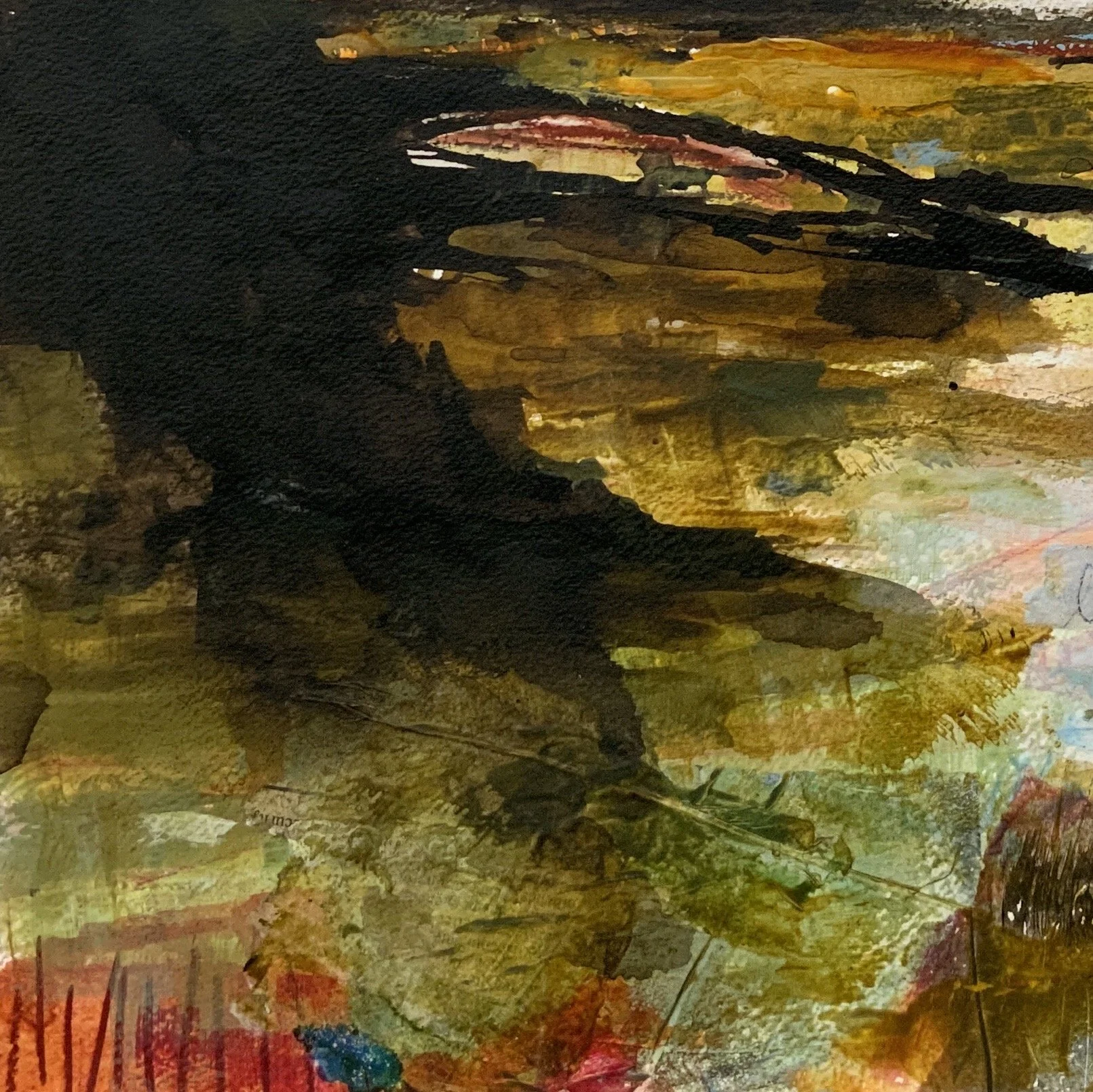 This painting is made with acrylic paint and inks, collage paper, and various mark making tools like tailor’s chalk and graphite.